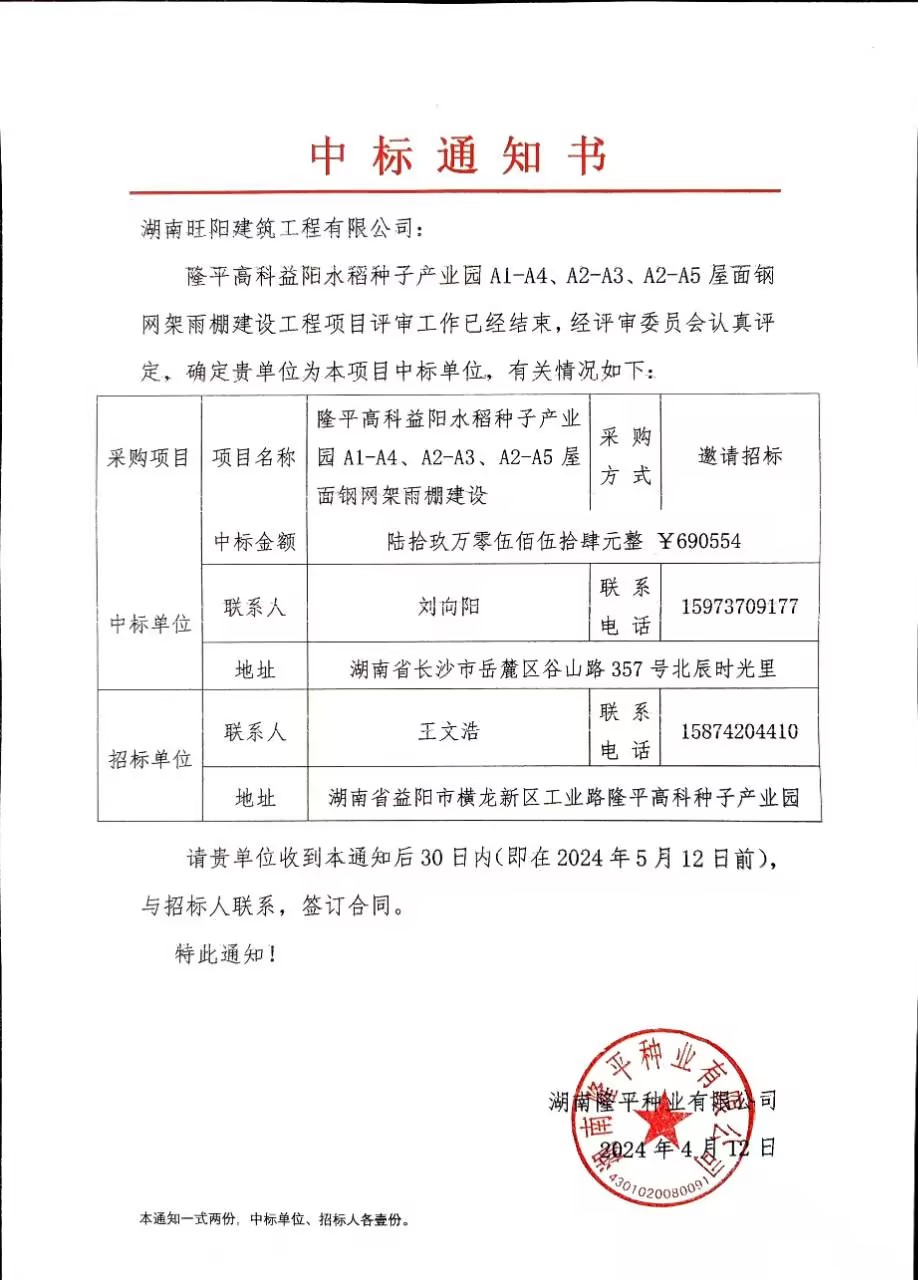 草莓视频污污污污高科益陽水稻種子產業園 A1-A4、A2-A3、A2-A5屋麵鋼網架雨棚建設工(gōng)程 中標通知書