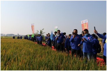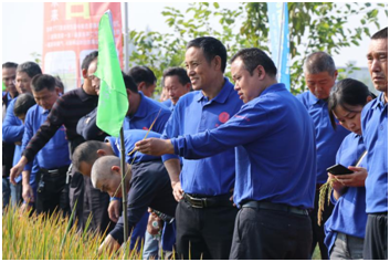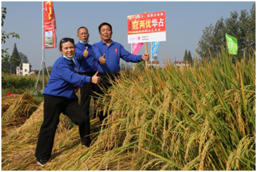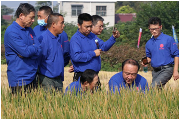 會議上午,到場的代(dài)理商(shāng)和零售(shòu)商現場見證了鼎城區十美堂鎮黑山嘴冠兩優華占種植表現,對品種的抗倒性(xìng)、分(fèn)蘖力(lì),結實率等讚不絕口,紛紛豎起大拇指並合影留念(niàn)。