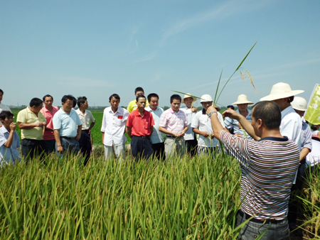 會議首先組(zǔ)織(zhī)大家觀摩了位(wèi)於漢壽縣大南湖和鼎城區韓公渡的準兩優608種(zhǒng)植現場。兩處觀(guān)摩現場麵積都在35畝左右,田間生長平衡,株型矮,莖稈粗壯,有效穗多,熟相好,結實率高,籽(zǐ)粒飽滿,頭季平均畝產在1300斤以上。參(cān)觀過程中,公司栽培專家現(xiàn)場對準兩優608的一季+再生稻的播種(zhǒng)期,再生稻施肥時期和水平(píng),收割(gē)部位及(留樁(zhuāng)高度)等關鍵性栽培技術(shù)做了現場(chǎng)演示和講解(jiě)。各級經銷商和種植大戶興(xìng)趣很高,尤其是(shì)看到(dào)再生芽已經開始(shǐ)分化,並長勢很好,大家紛紛向種(zhǒng)田農戶和栽培專家詢問(wèn)再生(shēng)稻的栽(zāi)培知識。