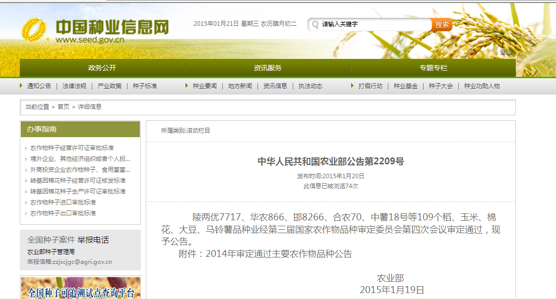 昨日,從農業部在中國種業信息(xī)網(wǎng)上發布的《中華人民(mín)共和國(guó)農業部公告第2209號》文(wén)件獲悉: